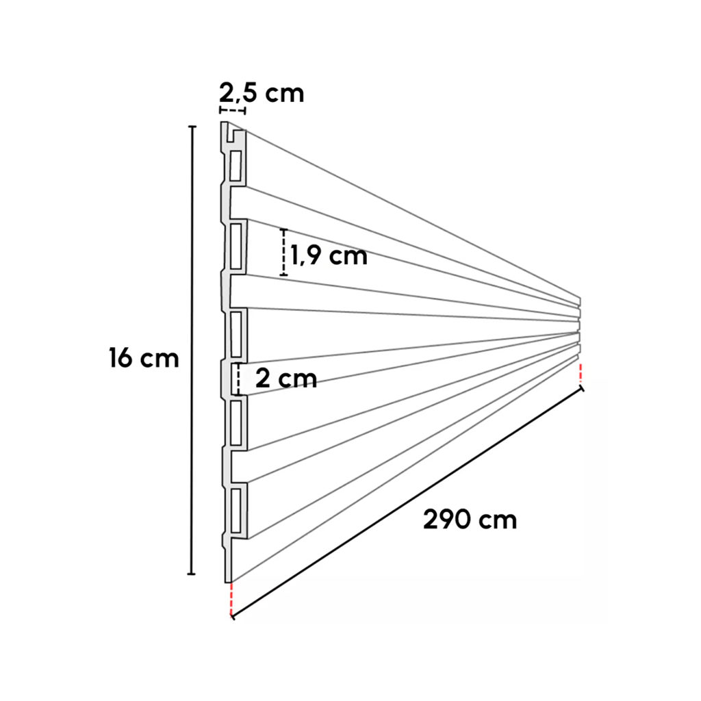 Dimensões Imponentes: Comprimento de 290cm (2,90m), largura de 16cm e espessura de 2,5cm, cada placa de nosso Painel Ripado Interno Alto proporciona uma presença majestosa e sofisticada em qualquer ambiente.